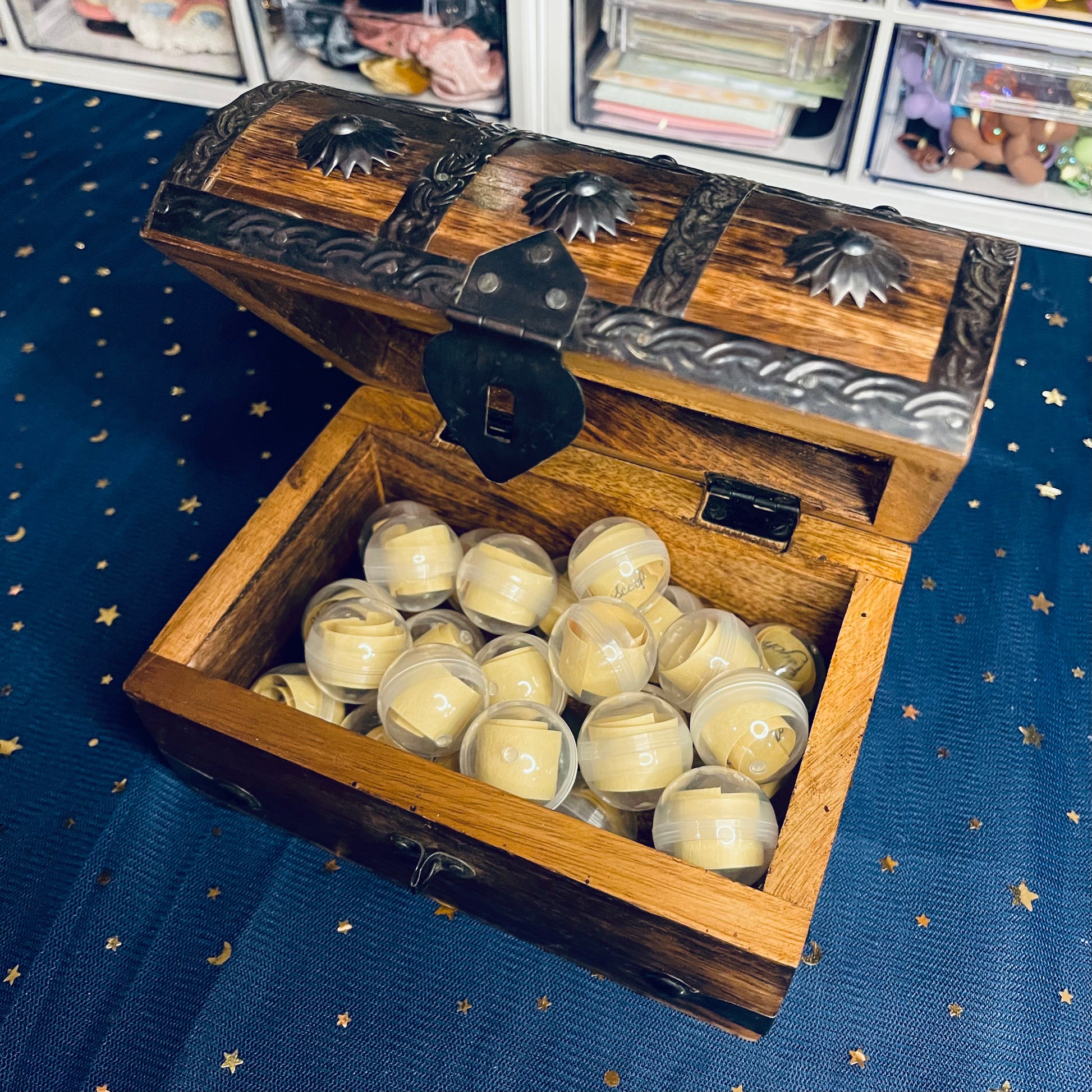 Each capsule in our treasure chest holds a premium surprise that will add an extra touch of magic to your mystery bundle. You can purchase up to TEN capsules, each holding ONE premium gift, like a coin purse, journal, beaded keychain, or spa accessories.
